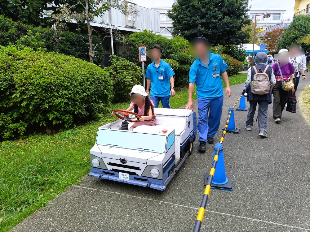 ここでは区役所の駐車場の向かいにある「鎧の渡し緑道」を、かわいらしいゴミ収集車にのって運転することができます。