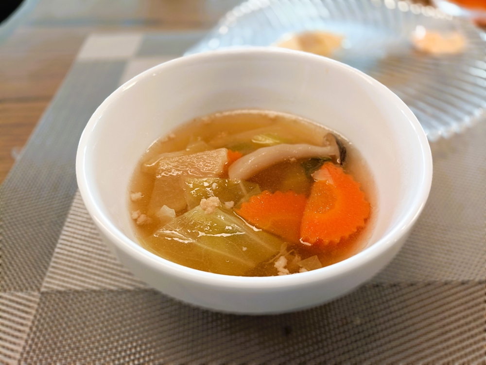 途中で具材がどっさりと入った「豚肉と野菜のクリアスープ」を挟みます。あっさりしているので、ガパオライスと一緒にいただくのにちょうどいい味。