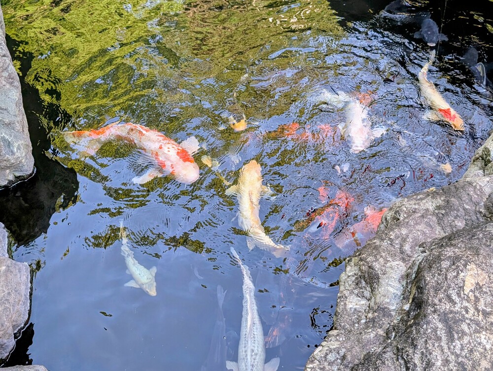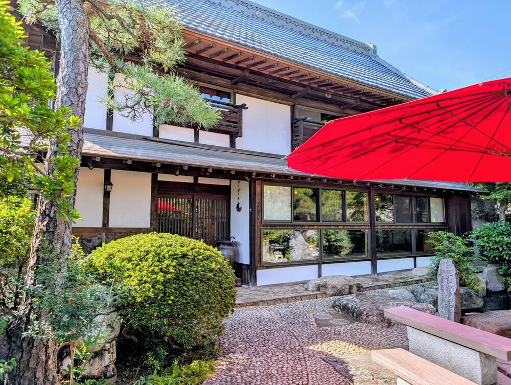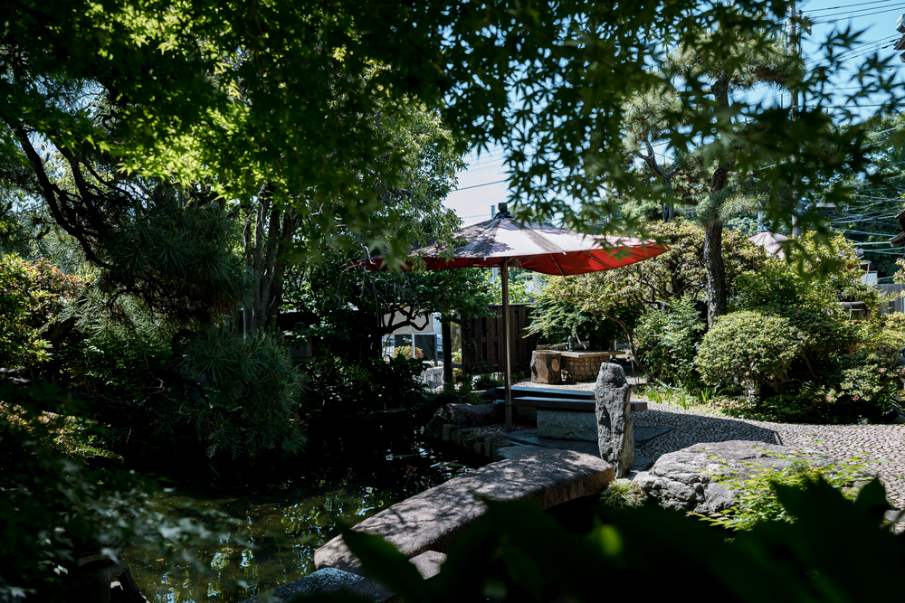 鯉の泳ぐ大きな池が広がる庭を備え、シンボルの赤い傘の下で撮影も定番です。
