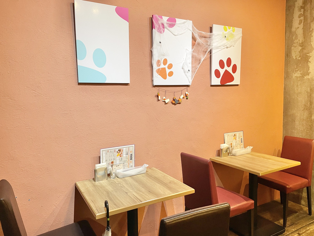 テーブル席の上には、お店の名前「nikuQ(にくきゅう)」にちなんだ肉球のイラストが描かれていて、さりげない遊び心に思わずほっこりしました。