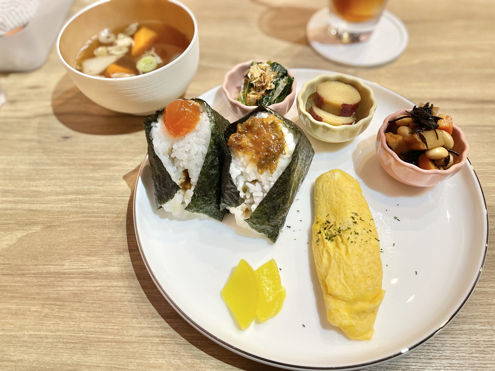 プレートには、おにぎり2個+小鉢3種+卵料理+漬物+汁物がセットになっており、ボリューム満点で食べごたえも抜群。