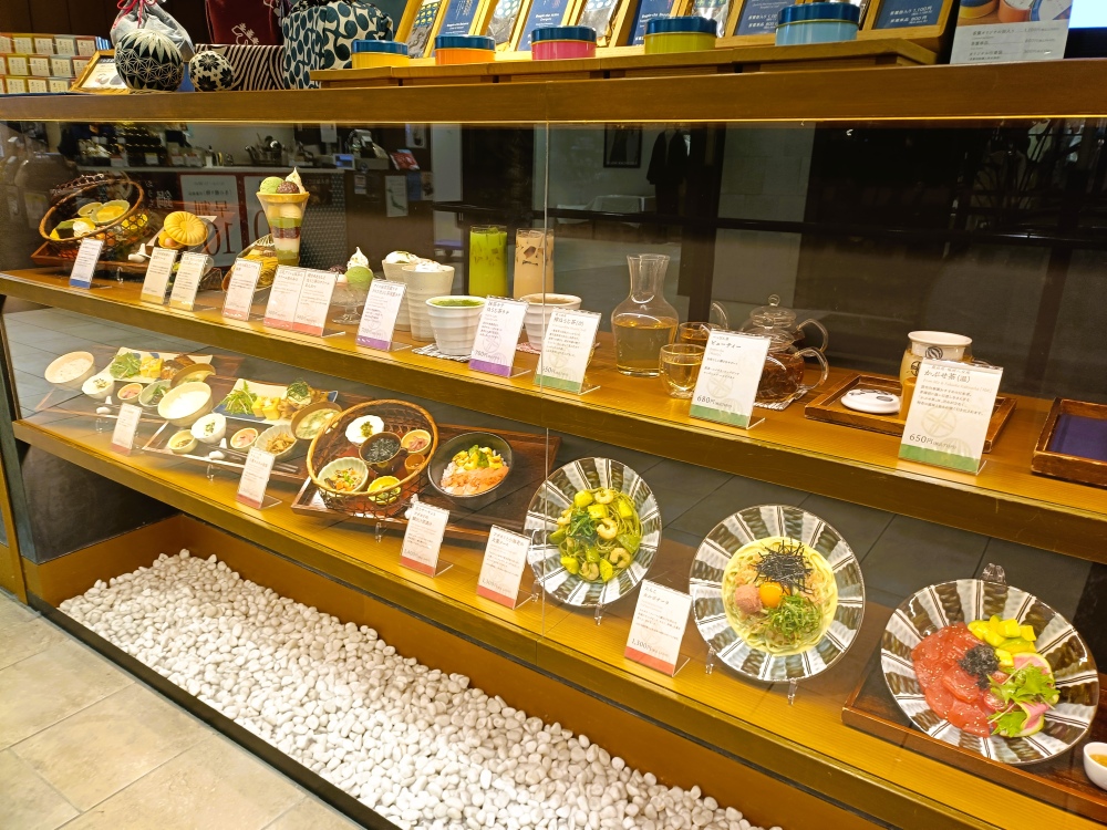 入り口前のショーケースには、和カフェのイメージにぴったりのお膳やパスタなどのメニューが所狭しと並びます。
