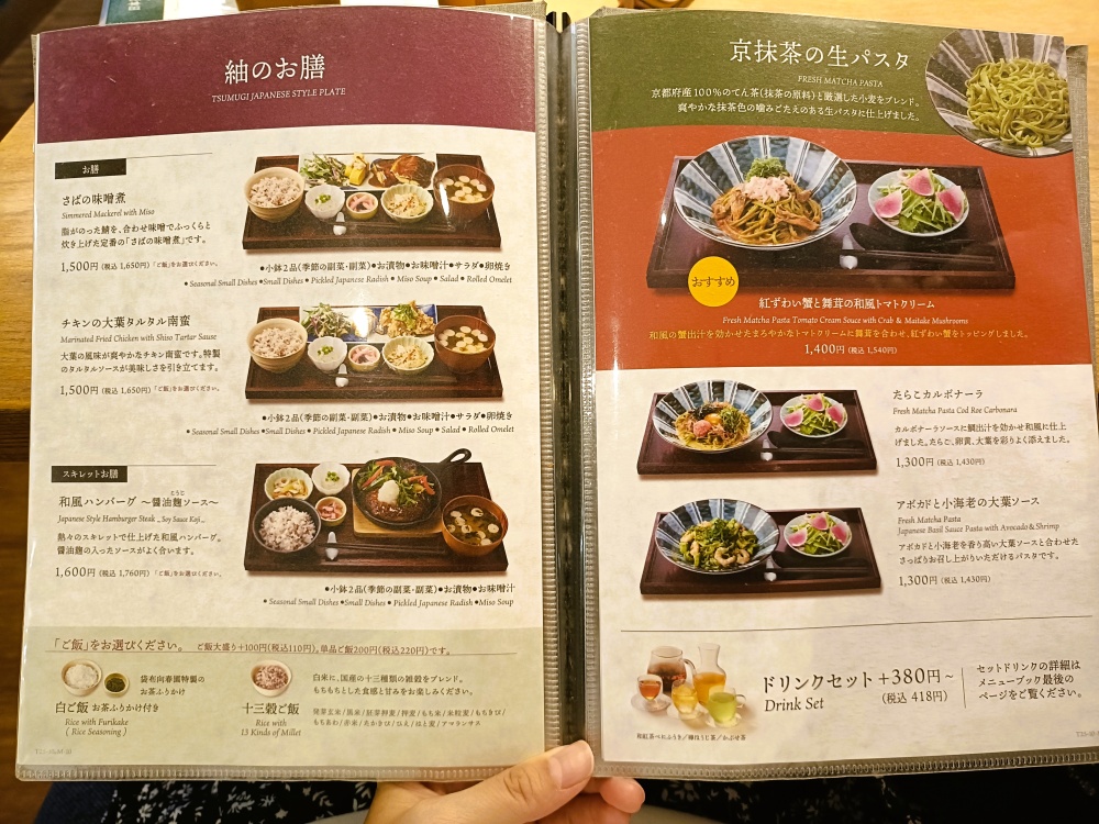 さらに抹茶の原料である「てん茶」をブレンドしたパスタなど、どれもこだわりある食事メニューが並びます。