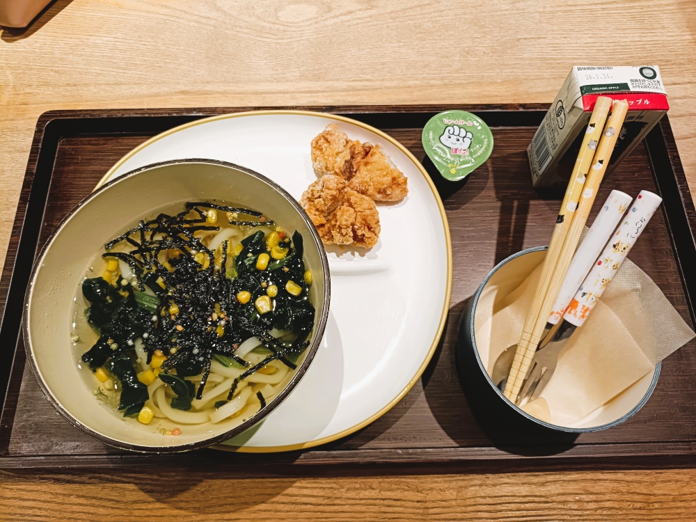 子どもが選んだお子様うどんは、うどんに唐揚げとゼリー、りんごジュースがついてきます。