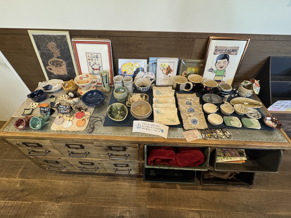 スタッフの方が陶芸の先生と作成したマグカップやお皿など購入もできるそうで、店内にはたくさんの作品が飾ってありました。