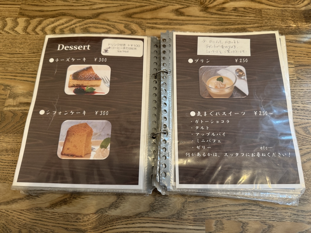デザートも充実していて、シフォンケーキやバスクチーズケーキ、プリンなど、食後につい頼みたくなるラインナップ。