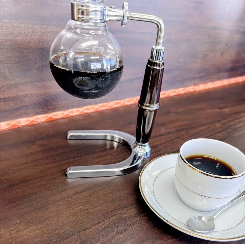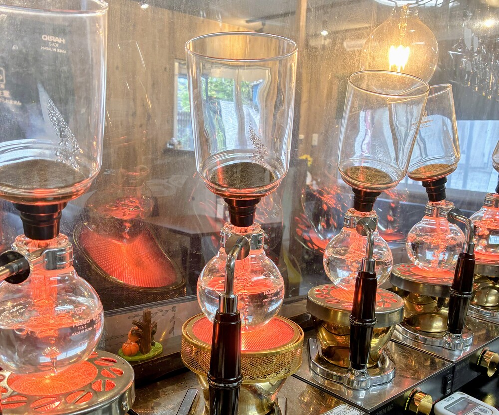 抽出方法はすべてサイフォン式。お湯がフラスコからロートに上がって、コーヒー豆と混ざり合う、それはコーヒー好きには幸せな時間です。