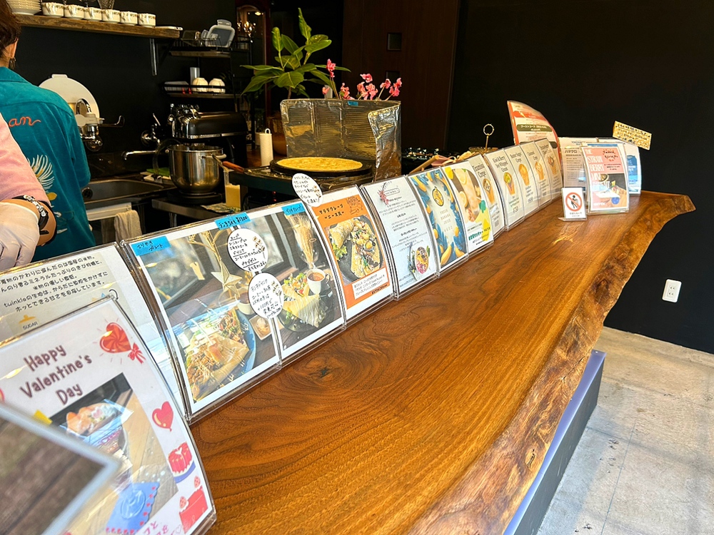 お店に一歩入ると、おしゃれな一枚木のカウンターに、クレープメニューがずらり!