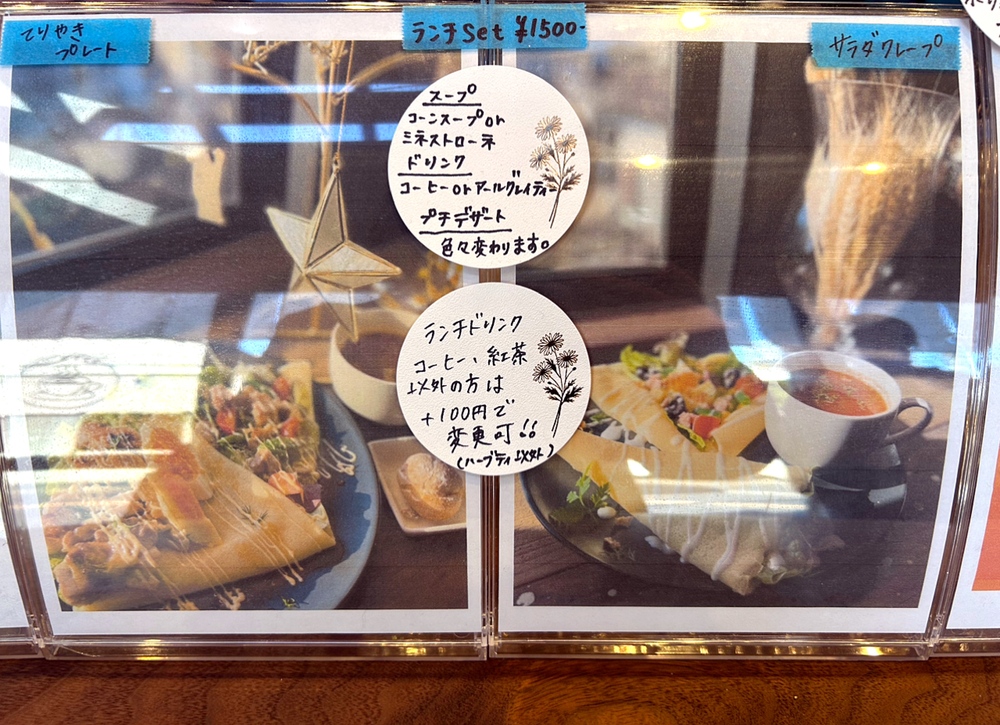 この日のランチセットは、てりやきプレートと「サラダクレープ~ニース風~」。コーンスープやミネストローネ、ドリンクがセットになっており、ランチタイムの利用も可能です。