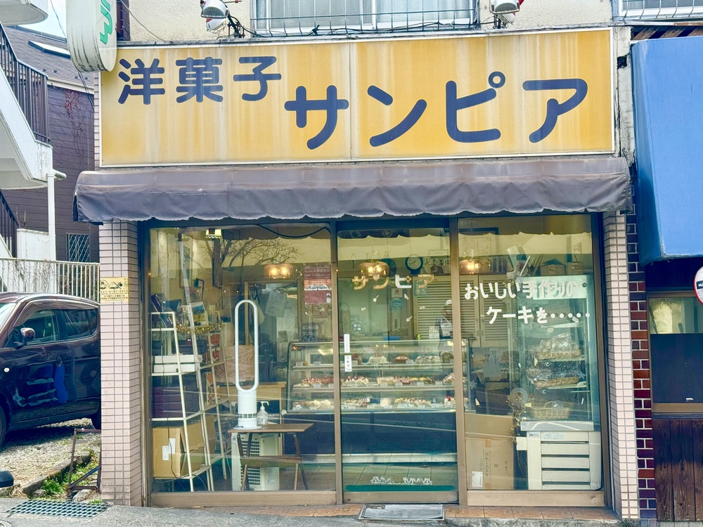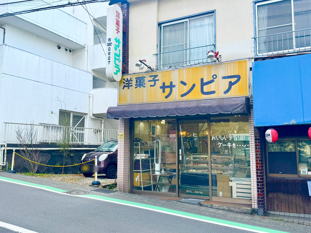 黄色い看板に大きく「洋菓子サンピア」と書かれていて、ガラス越しにショーケースが見える、いかにも昔ながらのケーキ屋さんという佇まいです。