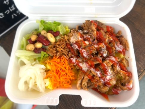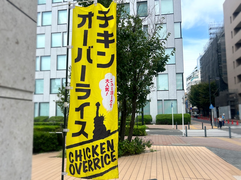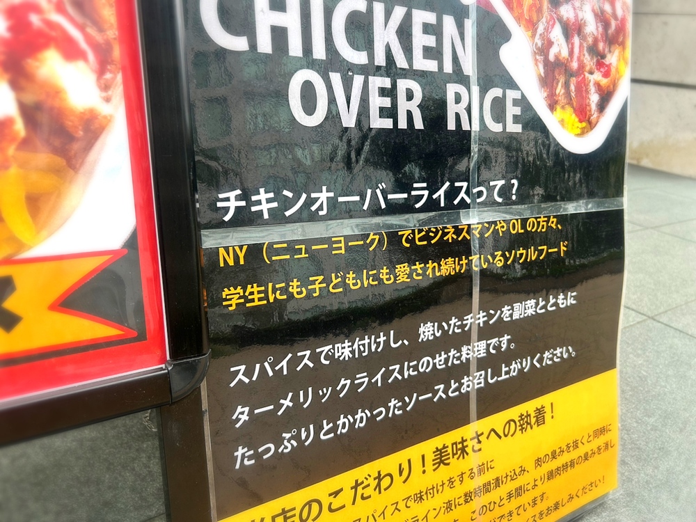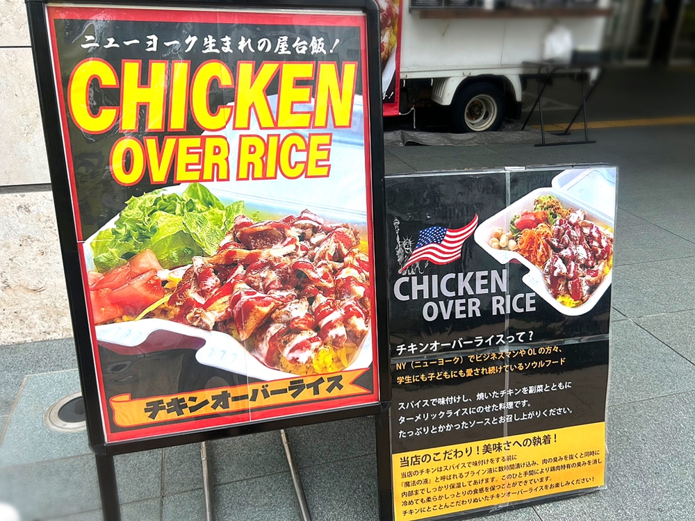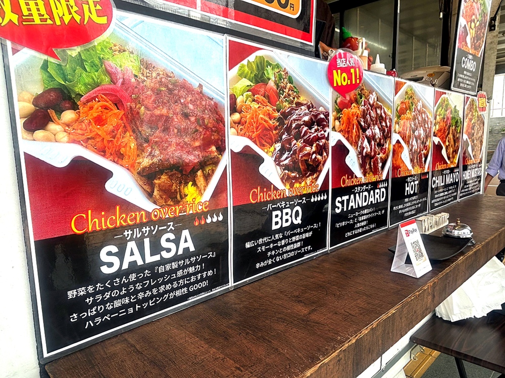 曜日やシーズンでラインナップが変わるようで、この日はいろいろなソースが選べる、チキンオーバーライスの日でした。