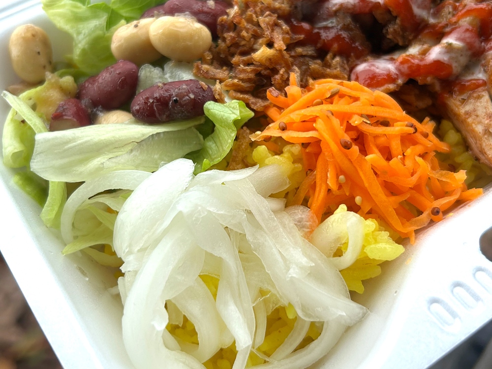 副菜は、クミンとマスタードシードが入ったキャロットラペに、玉ねぎのマリネ、ミックスビーンズとレタス。