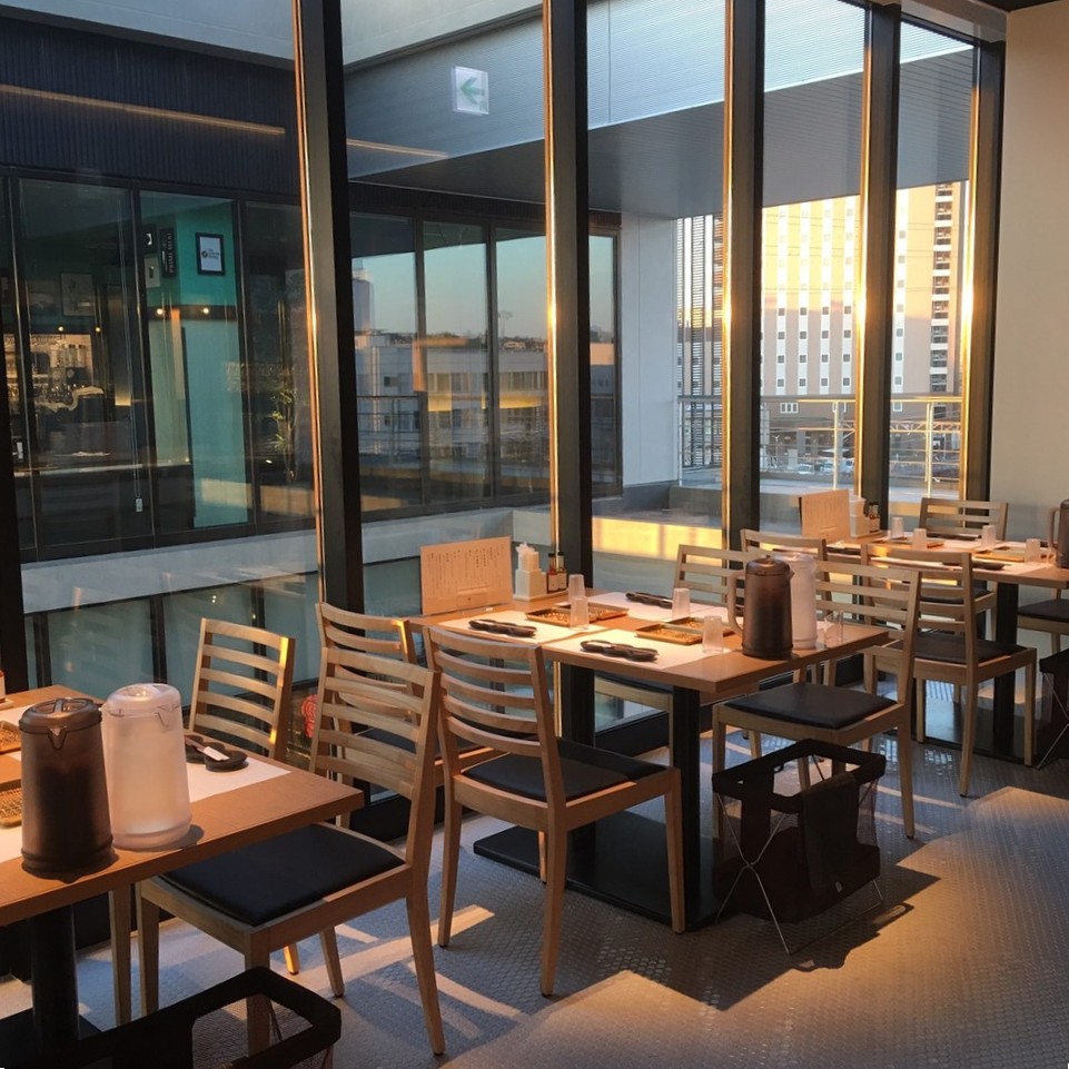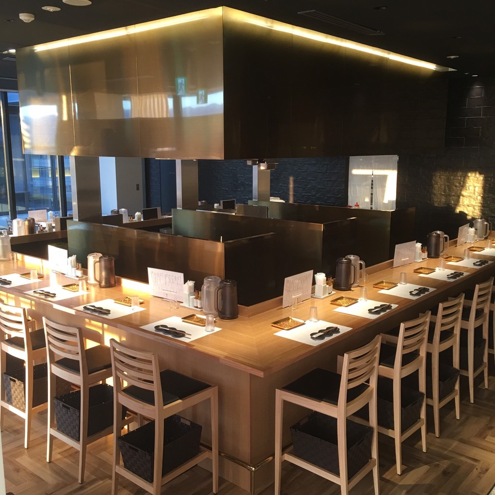 店内は、和の温もりを感じるモダンな雰囲気。中央のキッチンスペースを囲むカウンター席のほか、2名・4名掛けのテーブル席も完備されています。