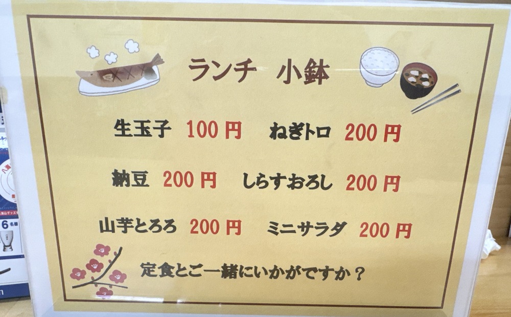 さらにランチの小鉢として生玉子(100円)、ねぎトロ(200円)、納豆(200円)、しらすおろし(200円)、山芋とろろ(200円)、ミニサラダ(200円)を追加注文することができます。