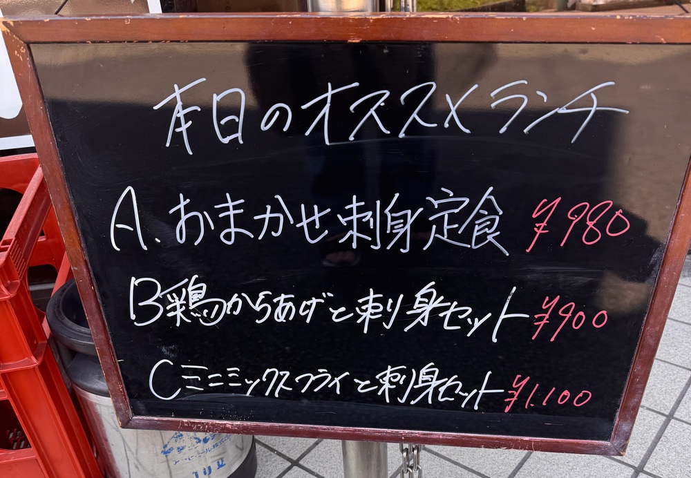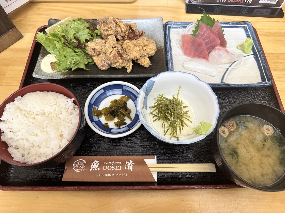 どれも魅力で迷ってしまいますが、私はさっぱりしたものを食べたい、でもがっつりしたものも食べたい、とどっちの思いも譲れず、鶏からあげと刺身セットを注文!