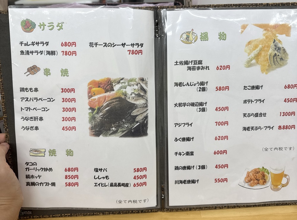夜は居酒屋として営業しており、新鮮な鮮魚や寿司、一品料理、串焼き、揚げ物など種類豊富なメニューを楽しめます。
