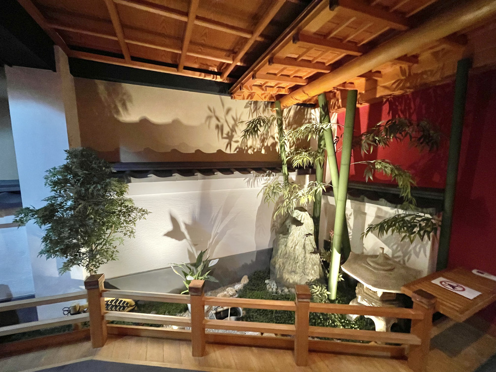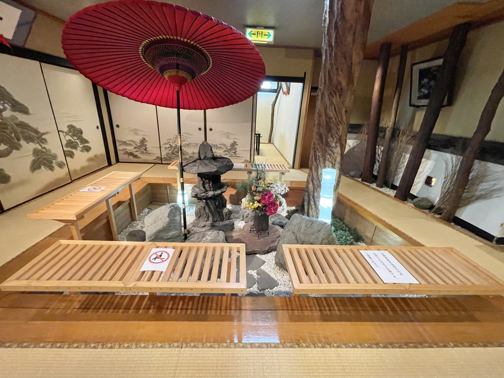 3階に上がると、まず目に入るのは灯籠や赤い和傘が映える坪庭風のスペース。