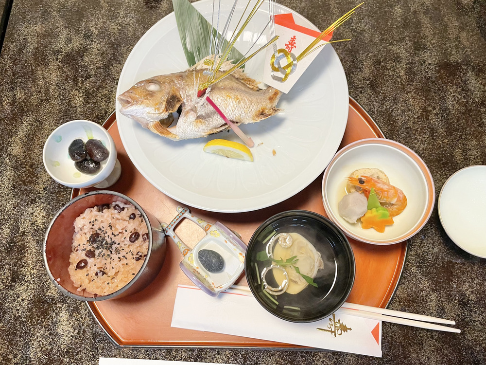尾頭付きの立派な鯛の塩焼きに赤飯、黒豆、吸い物、海老や里芋の入った煮物などが並び、とても豪華。