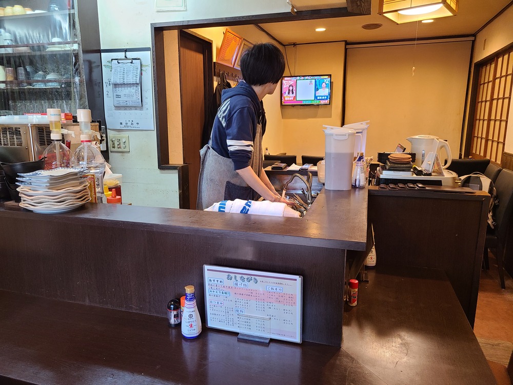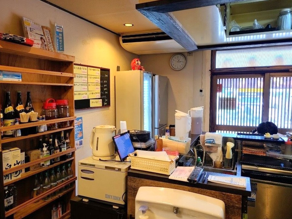 お店に入りました。「いらっしゃい!」と、気さくなオーナーが明るい声で迎えてくれました。入るとすぐにカウンター席があり、訪問したときはカウンター席は埋まっていました。写真はランチ終了間際に撮影したものです。
