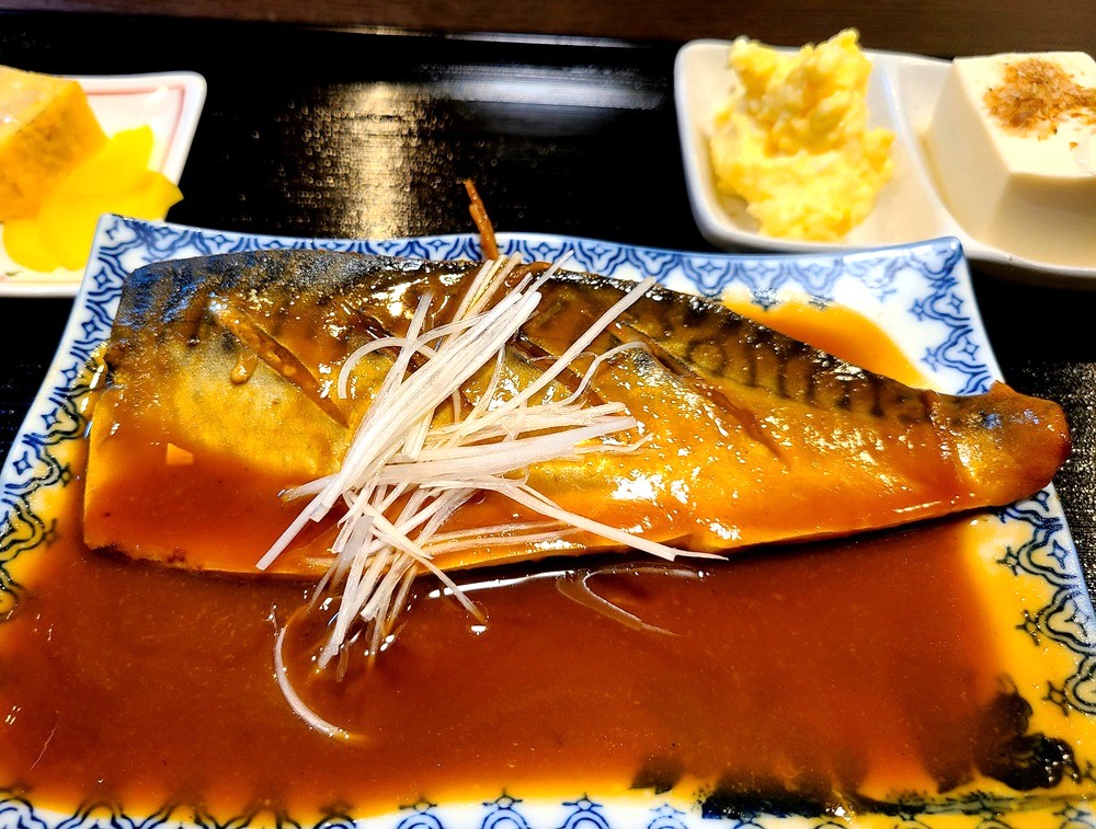 定食はメインのさばに加え、ご飯とおみそ汁、さらに冷奴、ポテトサラダ、卵焼き、お漬物の副菜もついた充実したセットです。バランスが取れていてどれも満足度が高く、全部いただきました。