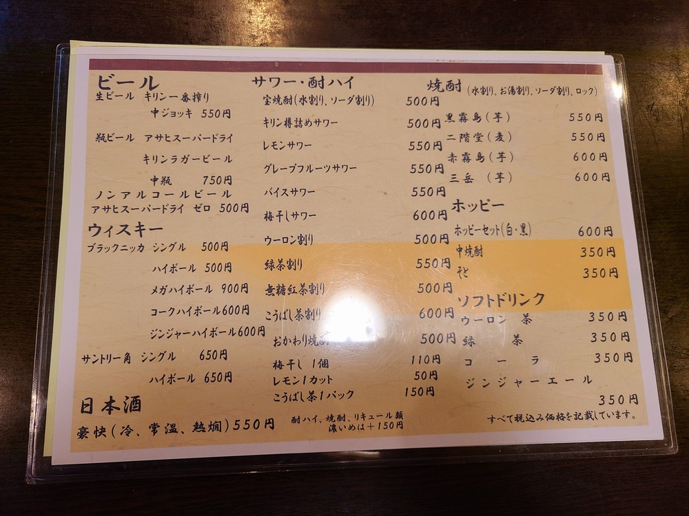 夜のドリンクメニューです。焼酎好きの私にとってうれしいラインナップです。ソフトドリンクもあるので、飲めない人でも楽しめます。