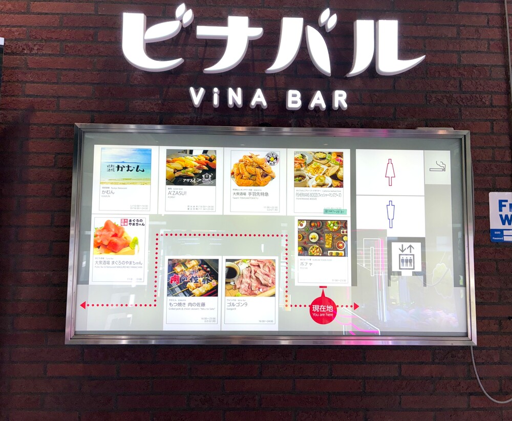 ビナバルは、オープンなスペースに8店の居酒屋が並ぶはしご酒場です。夜はにぎわいますが、ランチタイムは落ち着いた雰囲気で行列に並ぶことなく食事をすることができます。