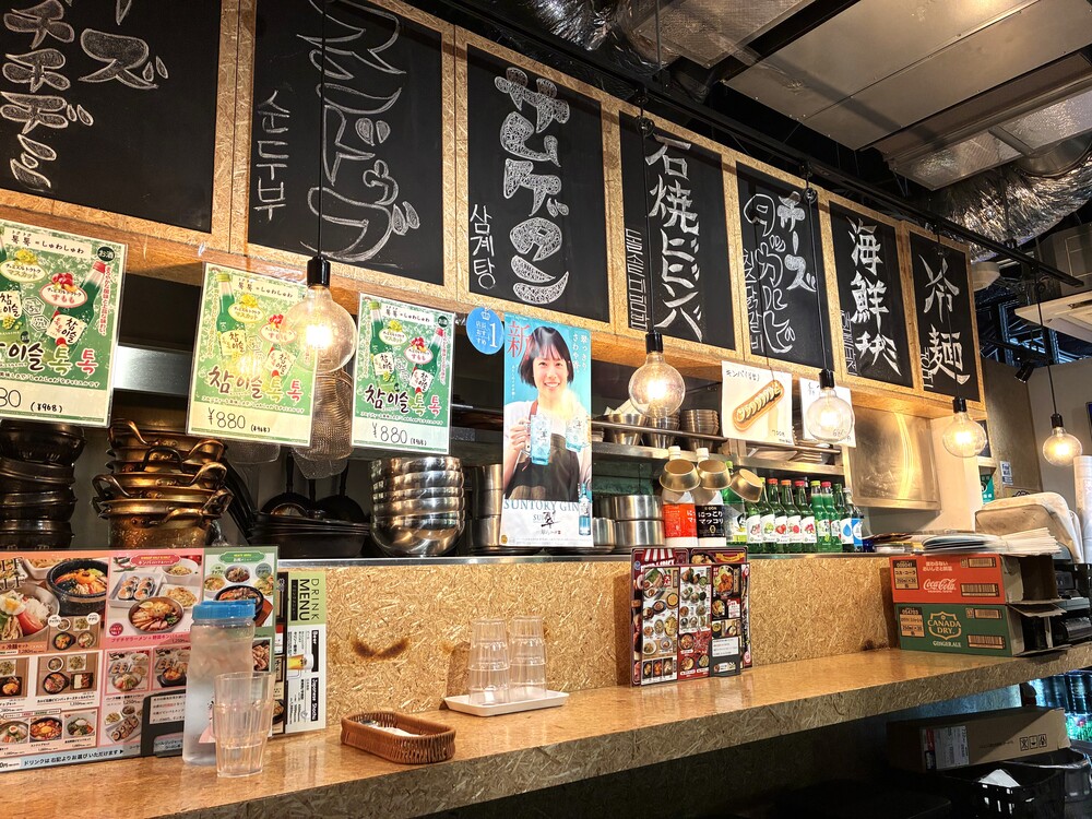 屋台らしく吊るされたはだか電球と、韓国の人気のお酒チャミスルや翠のポスター、カウンターに並ぶビビンバの器がいい雰囲気を出しています。