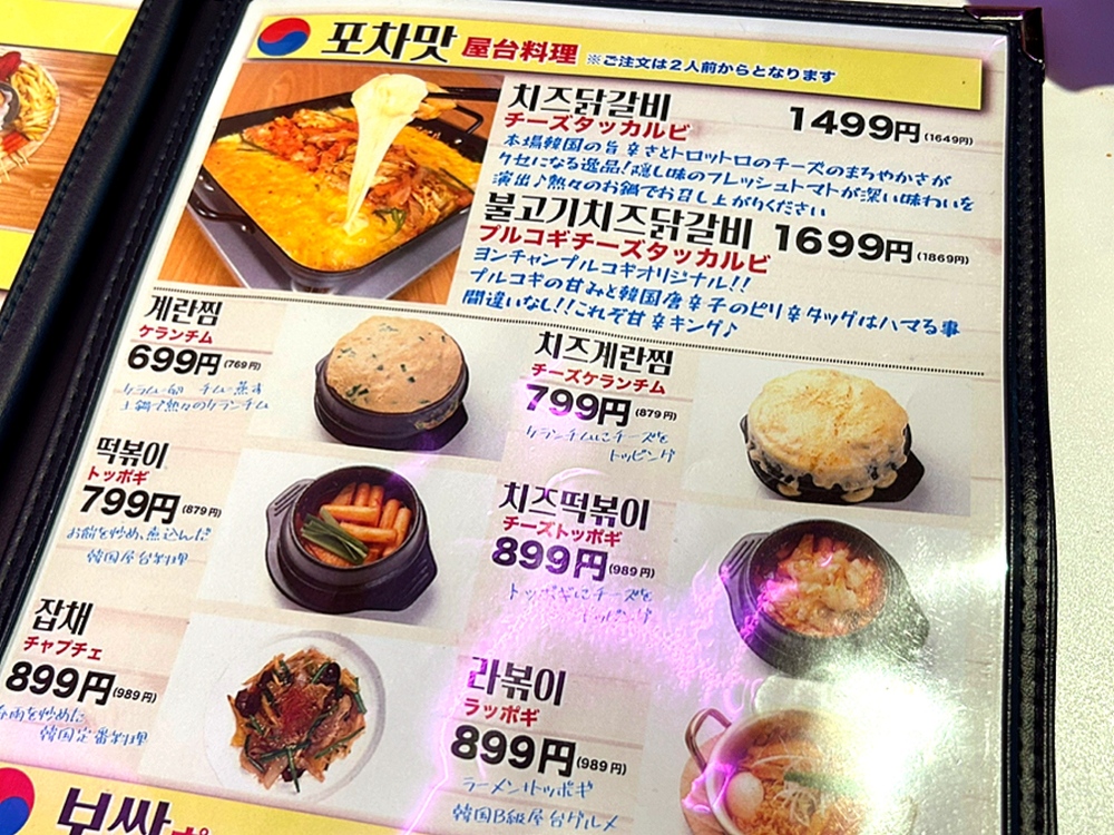 プルコギはもちろんサムギョプサル、マンドゥ(韓国の餃子)、チーズタッカルビにケランチムなど。