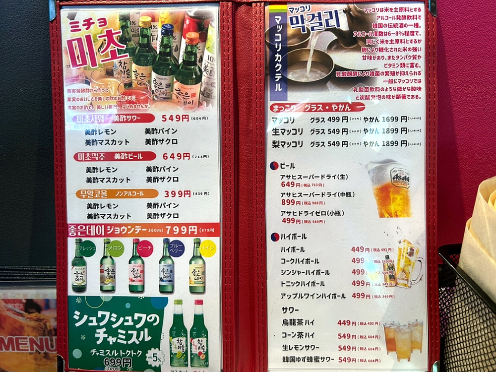 アルコールも韓国らしいラインナップ。もちろんソフトドリンクもありました。
