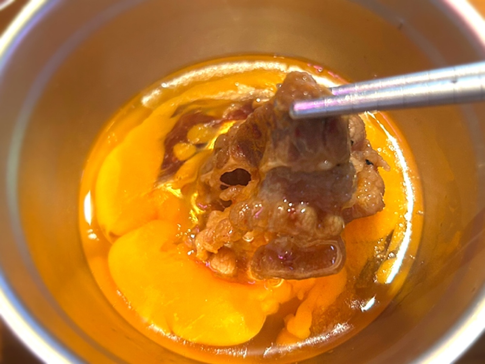 焼けたお肉を、すき焼きのようにコチュジャン入りの溶き卵につけたら……