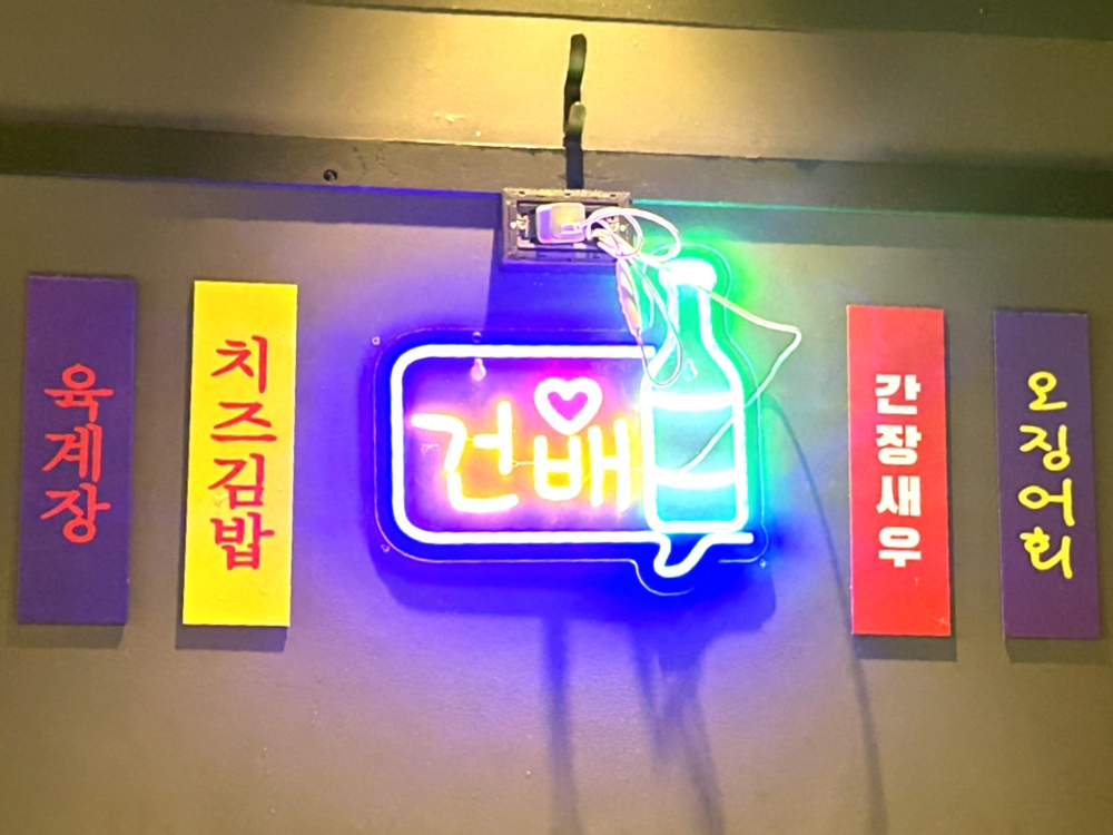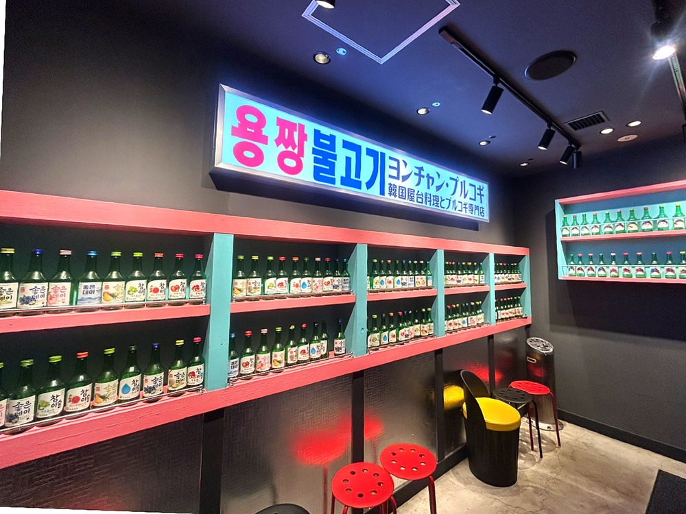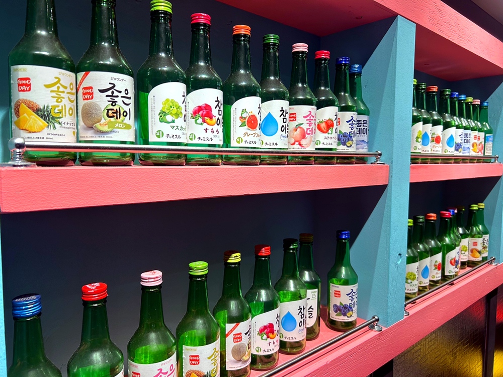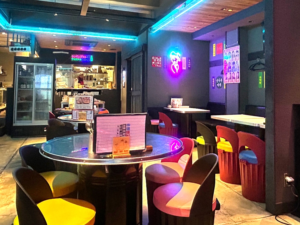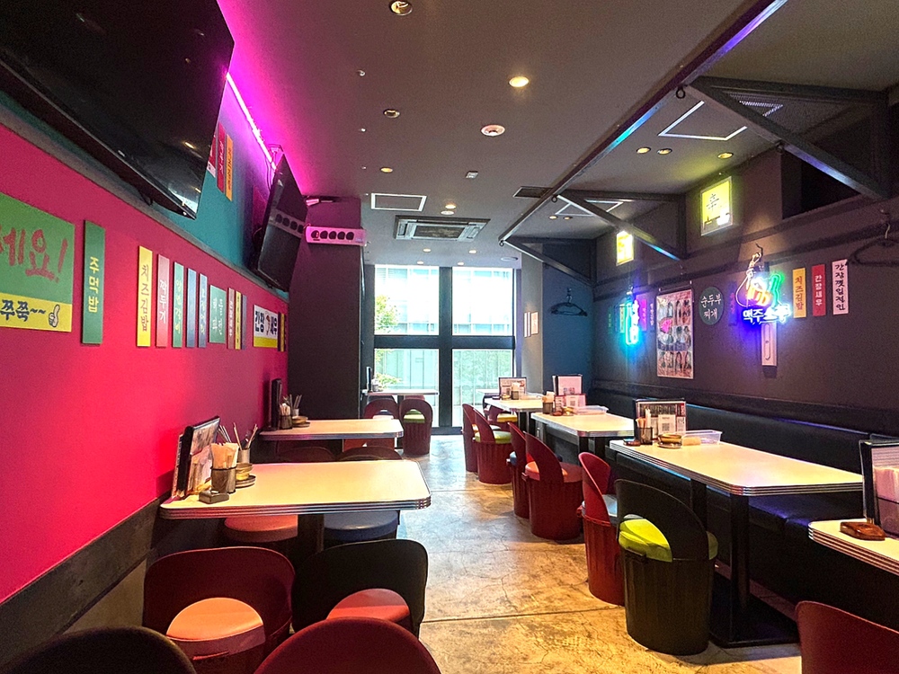 お店に一歩入れば、カラフルなネオンやハングルが目に飛び込んできます。チャミスルの瓶が並び、KPOPが流れて韓国現地の居酒屋のよう。