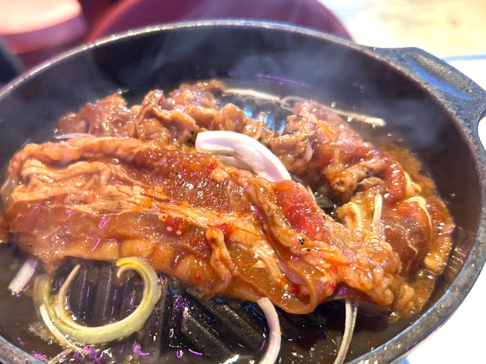 専用鍋に火をつけてもらい、セルフプルコギ調理開始です。油が跳ねるので、2枚くらいずつ焼くのがおすすめとのこと。
