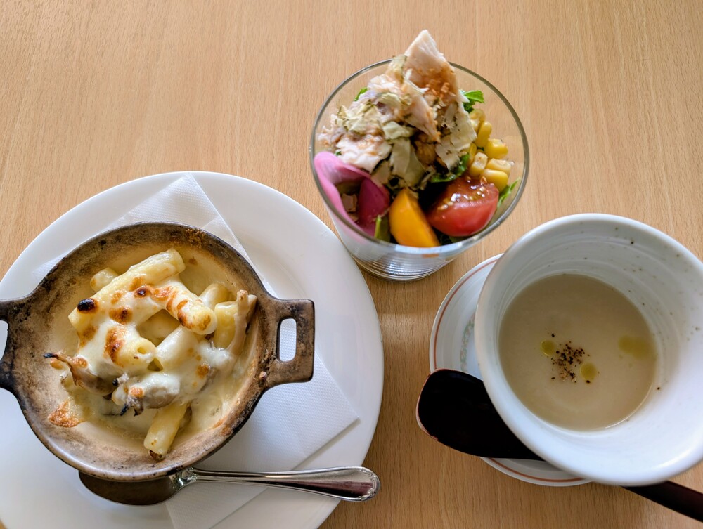 こちらは手作りのシーチキンがのったサラダ、マカロニグラタン、じゃがいもの冷製スープ。