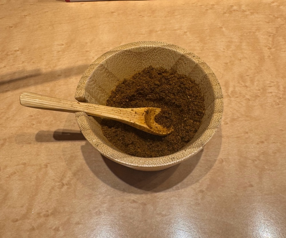 黒胡椒、唐辛子、青海苔、山椒など7種類の素材を合わせた、黒煎り七味。