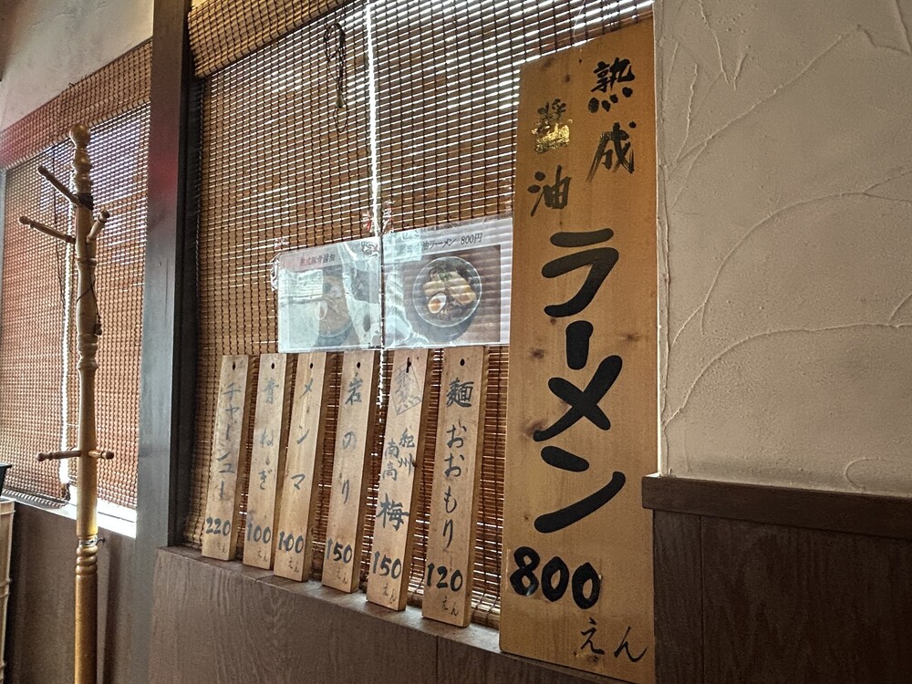 大きく「熟成醤油ラーメン」とあります。いろいろトッピングが選べるようで、大盛りにもできます。訪れた時は気付かなかったのですが、このほかに数量限定の「豚骨熟成醤油ラーメン」もあるそうです。