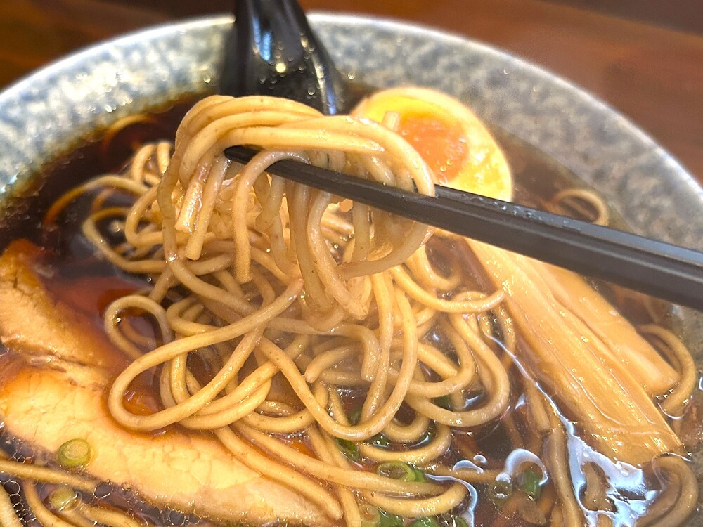 つぎに麺をひと口いただきます。もちもちとコシのある麺です。少し固めにゆでてあるのかな、と思いましたが、食べ進めるとちょうどよい食感になってきます。絶妙なゆで具合です。