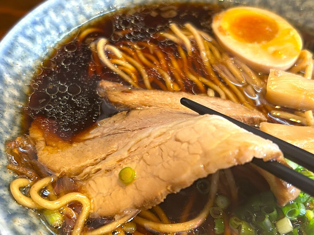 チャーシューは大きくて厚め。脂身からじゅわっと旨みが染み出てきます。食べ応えがあって満足度が高いです。