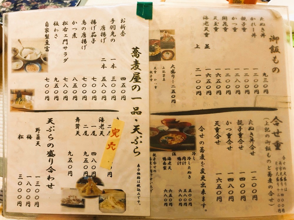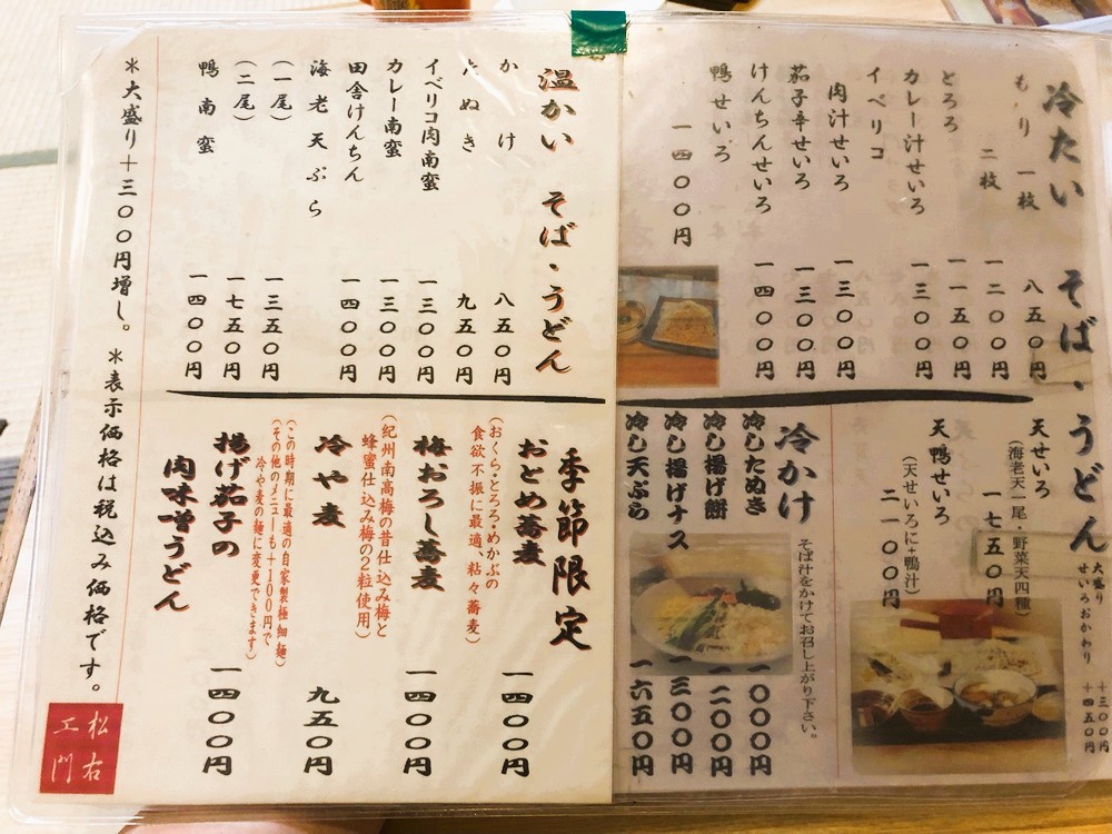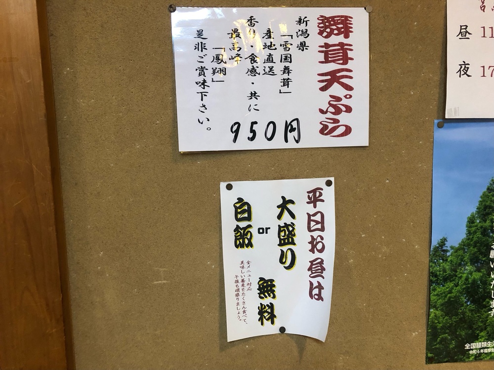 見逃してはいけないのは「平日お昼は大盛りか白飯が無料」という点です。記載のある通り、おいしいお蕎麦をたくさん食べたら、午後も元気に頑張れそうですね。