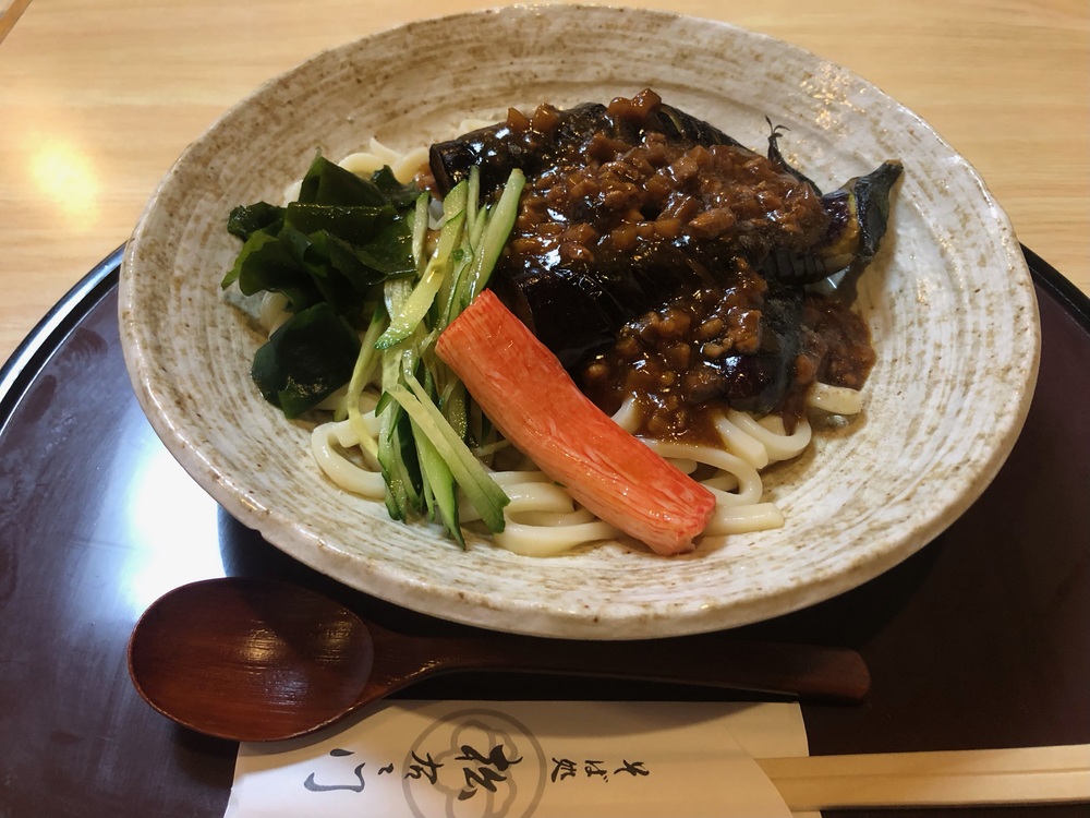 今回初めていただく「揚げ茄子の肉味噌うどん」です。冷たいうどんにアツアツ揚げたての茄子と肉味噌がのった一品。