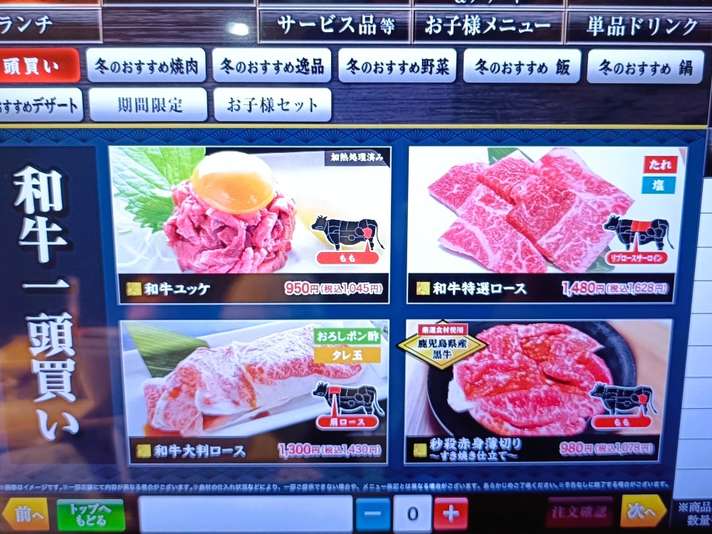 タブレットには、「和牛一頭買い」という項目があり、お店イチオシのこだわりのお肉が並んでいました。