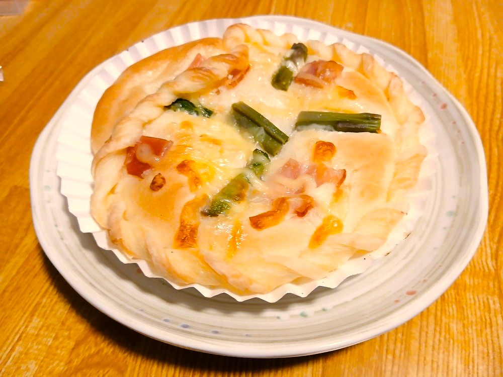 2点目が「アスパラパン」(2025年9月 撮影当時価格200円)。こちらも同様に、温め直していただきました。どのパンも素材の味が感じられるように作られていて、定期的に総菜パンが食べたいな、というときはこのお店が一番おすすめです。
