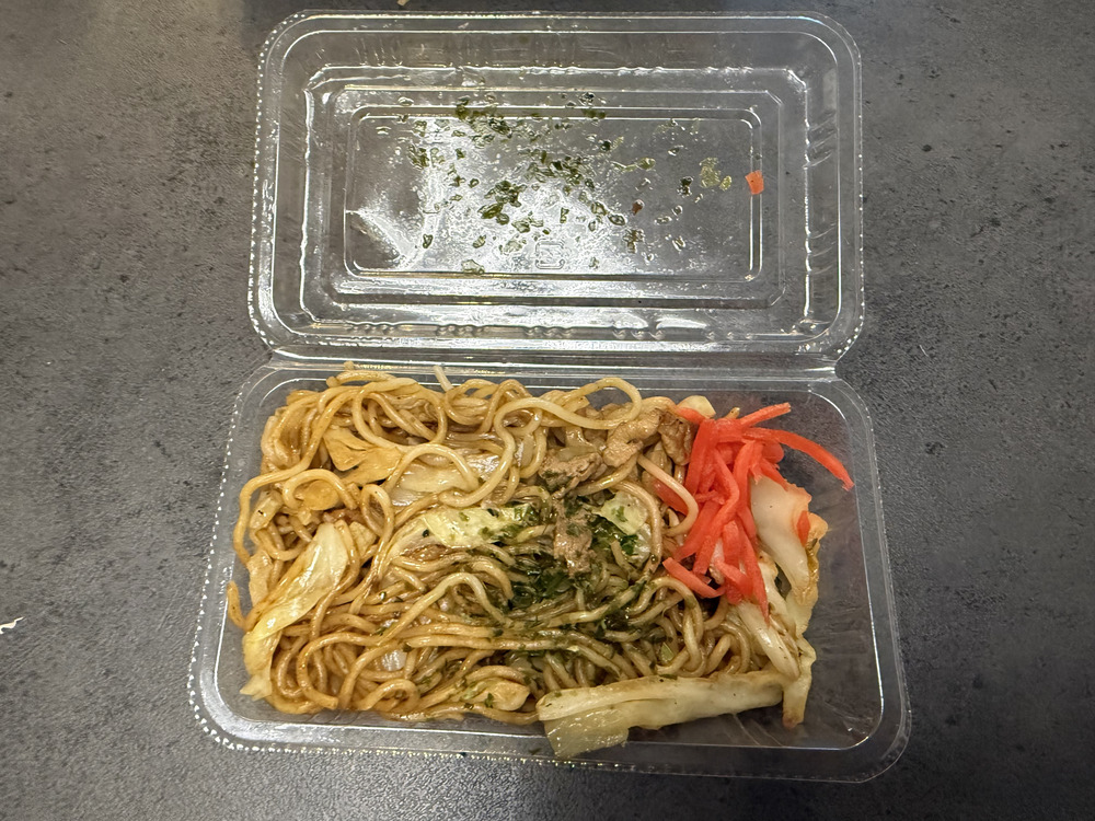ソース焼きそばは大きめに刻まれたキャベツとお肉、紅しょうが、青のりがのっていて定番で安心感があります。