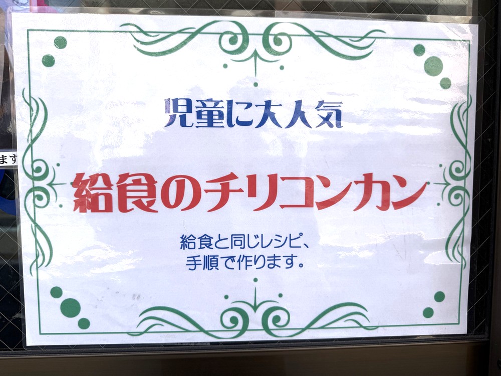 店主は昔、小学校給食の調理師をしていたそうで、小学校で人気のメニューだったチリコンカンを給食と同じレシピで提供しているそうです。