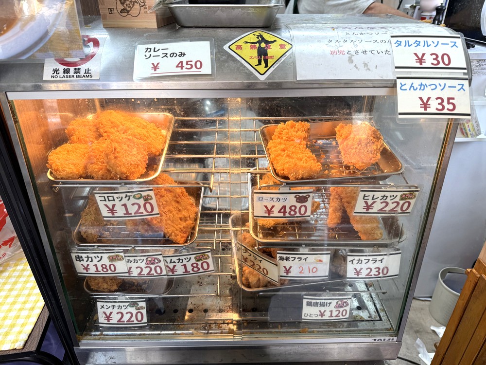 店内のほとんどのスペースは厨房になっていて、カウンターには揚げ物のショーケースだけがあります。