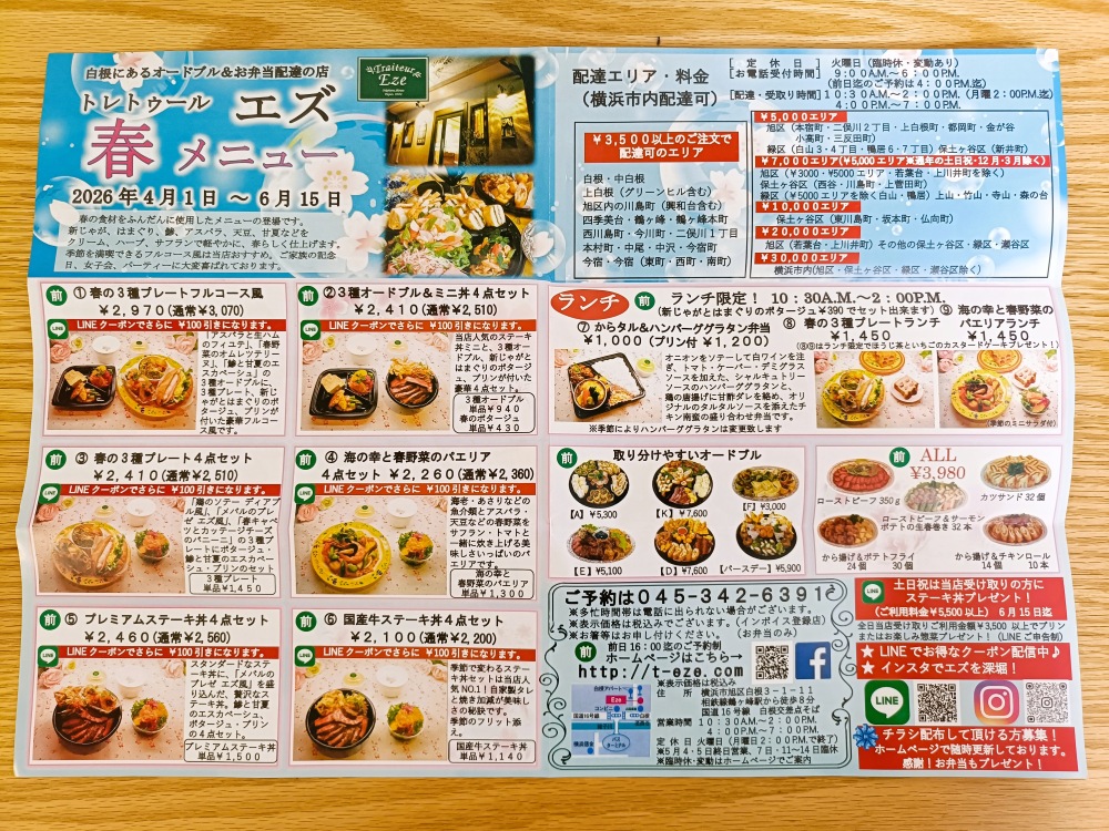 エズは完全予約制となっており、宅配・テイクアウトはいずれも前日16時まで(団体の場合は5日前まで)の注文が必要です。