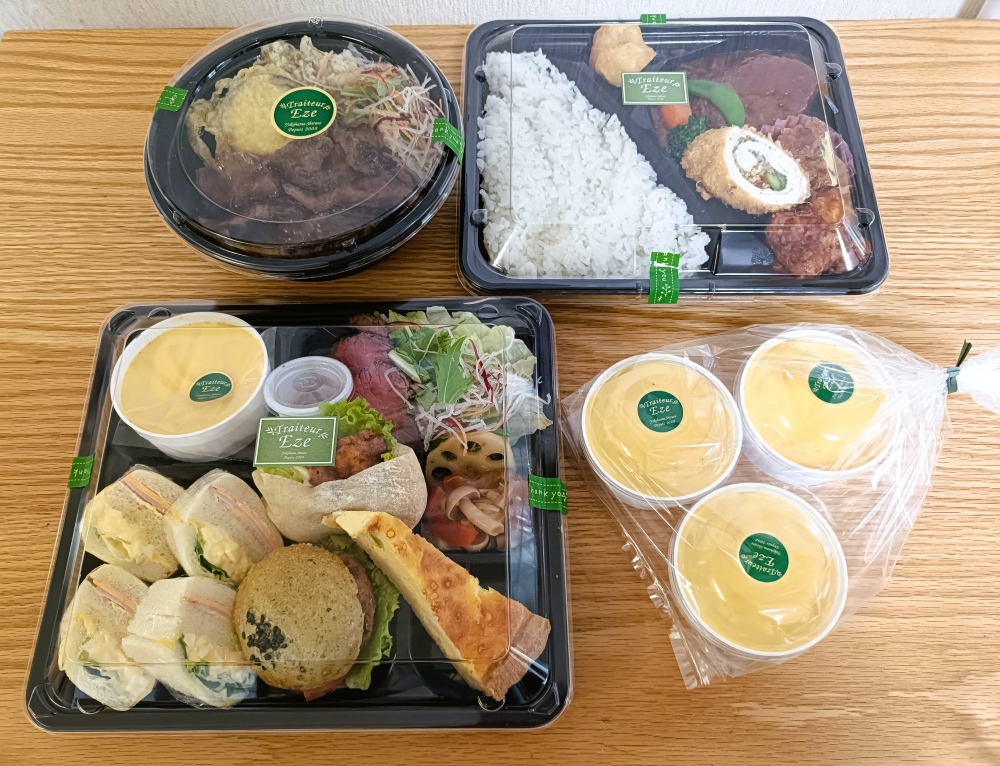 左下から時計回りに、サンドウィッチ弁当、ステーキ丼、季節のハンバーグ弁当(プリン付き)、クラシックなプリンです。