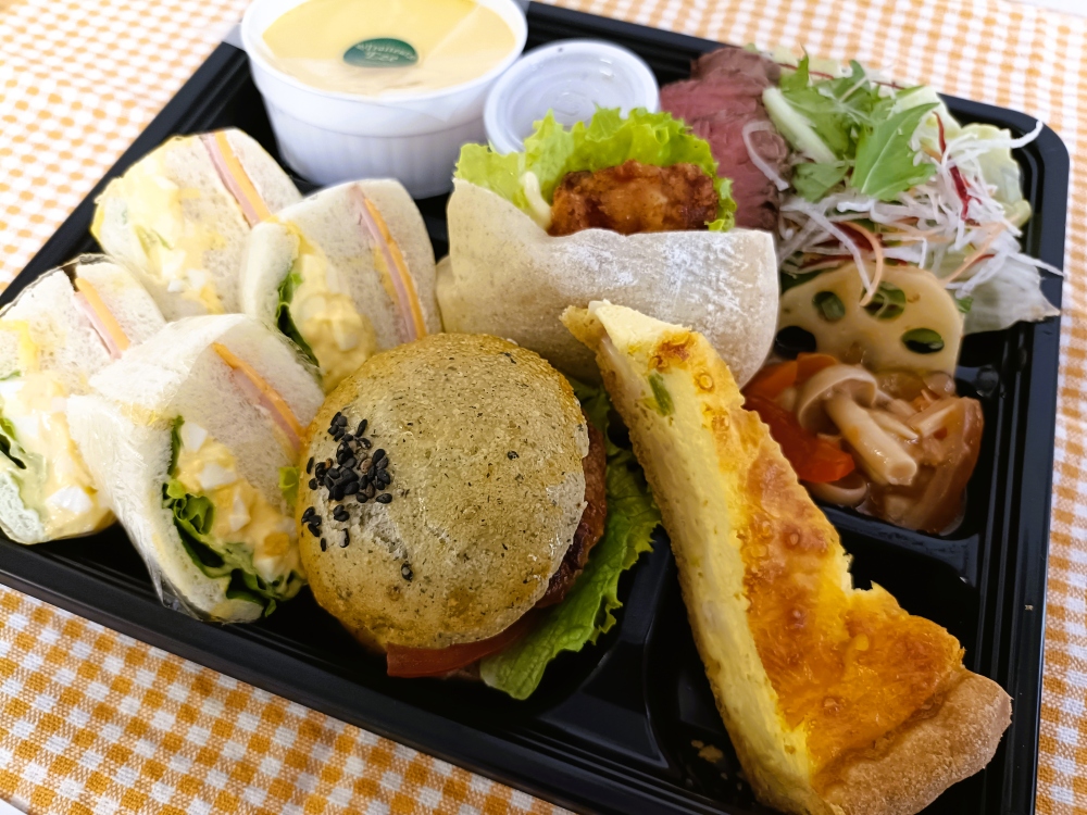 サンドウィッチ弁当には、メインのサンドウィッチをはじめ、ミニバーガーやから揚げが入ったピタなど、メイン料理が充実。