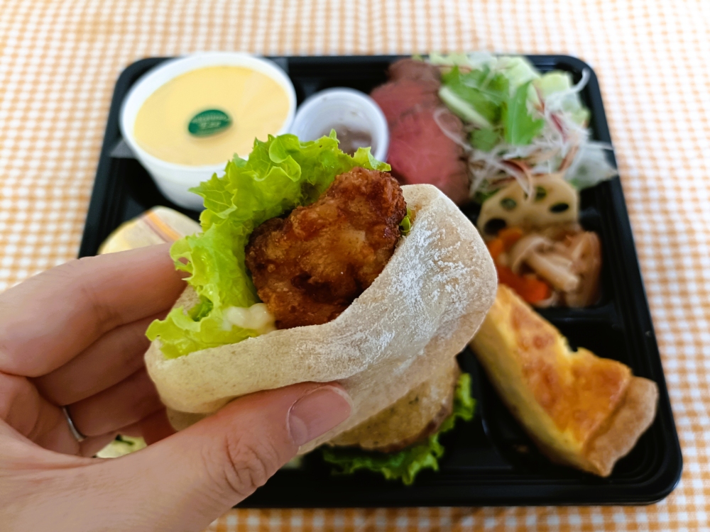 サンドウィッチは優しい食感で、定番のハムチーズとふわふわ卵が絶品。ピタは大きなから揚げが入っていました。