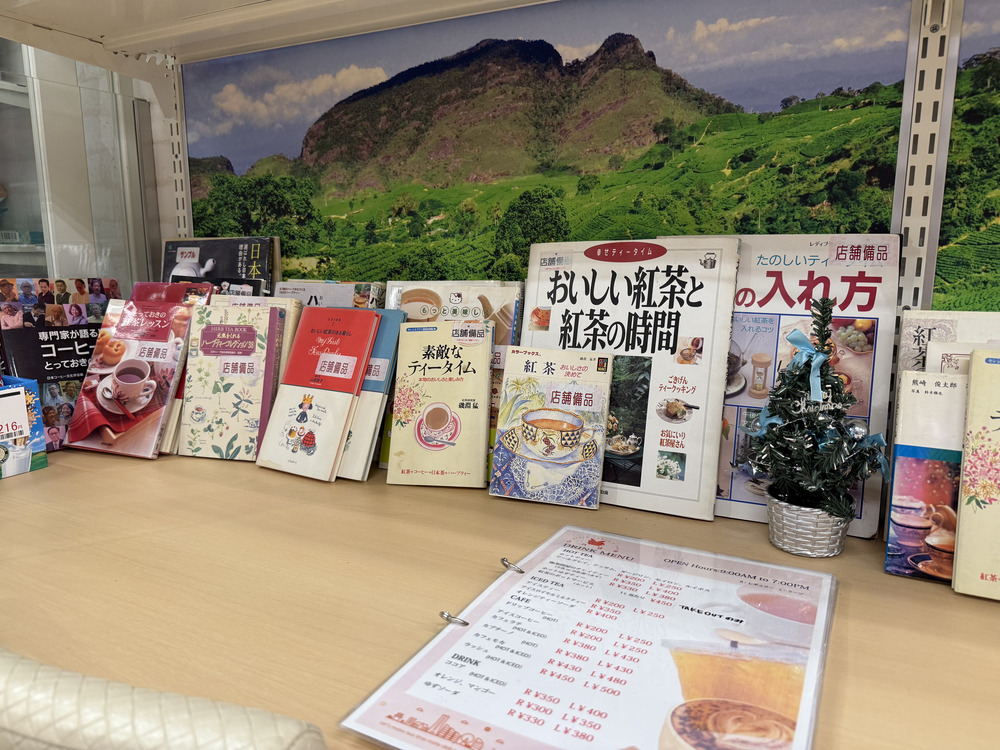 テーブルには紅茶やコーヒーにまつわる本がたくさん置いてあって、紅茶やコーヒーを飲みながらゆっくりと過ごすこともできます。