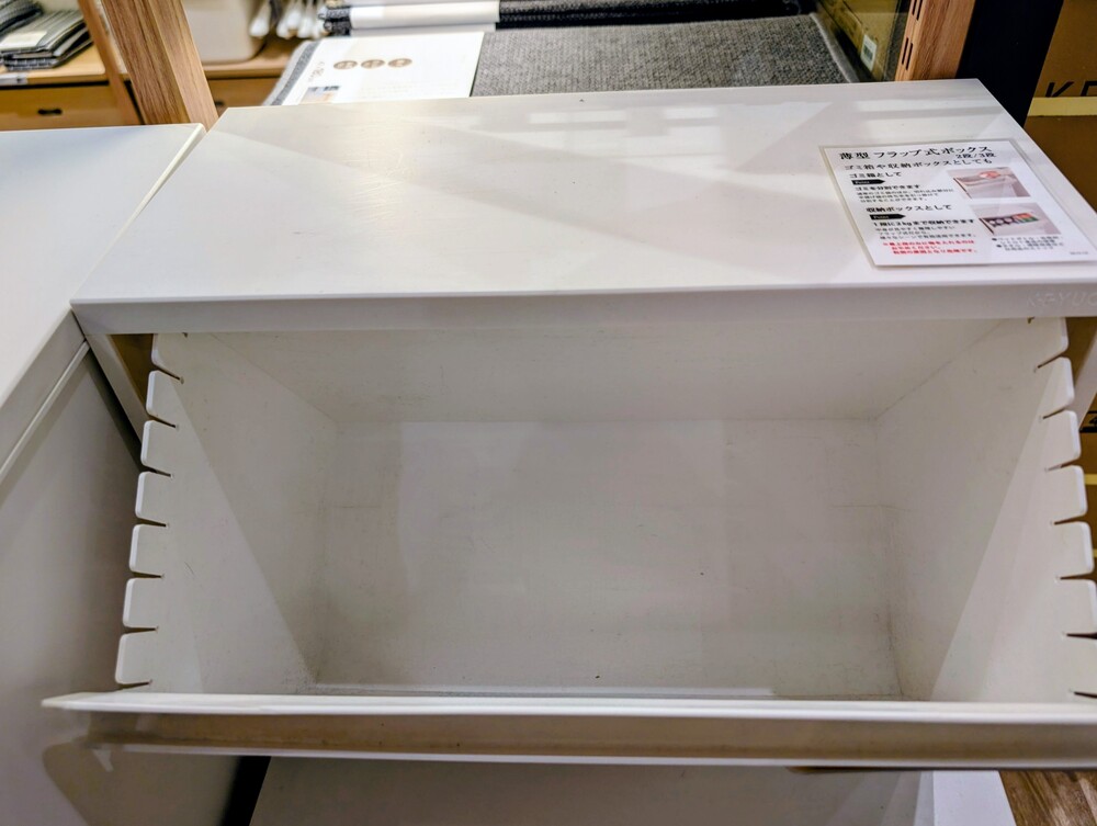 フラップ式なので、上に物を置いたままでも中のものを取り出せるのが便利です。